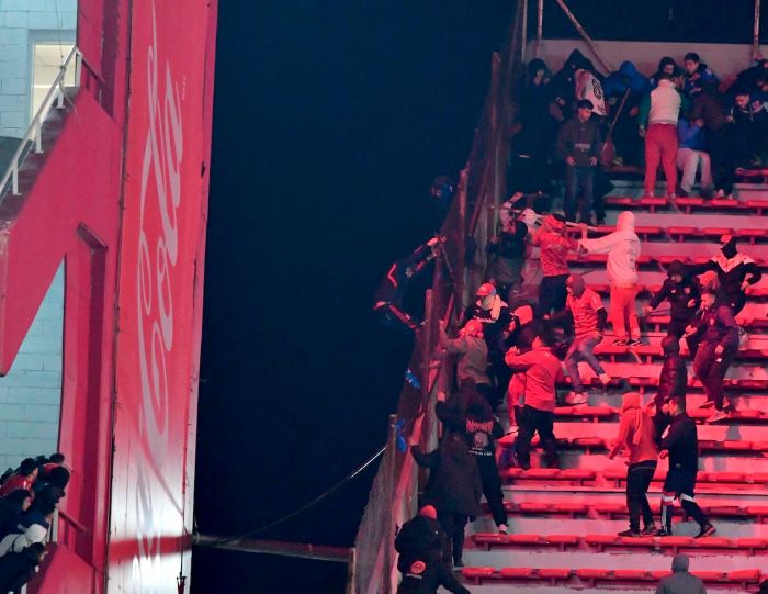 El momento más dramático se dio cuando unos 30 aficionados de U de Chile fueron rodeados por decenas de fanáticos de Independiente. Varios de los visitantes fueron obligados a quitarse la ropa mientras eran apaleados. Algunos corrían ensangrentados intentando salvar su vida. Al menos un par cayó al vacío desde la tribuna más alta por el acoso de los contrarios.